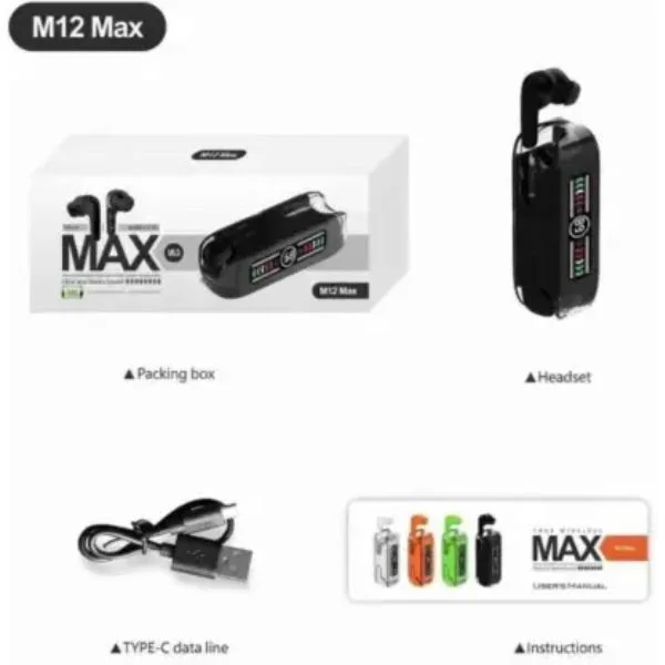 The M12 Max Compact Earbuds are also equipped with noise-canceling microphones, ensuring clear voice calls even in noisy environments. Whether you’re at home, commuting, or working out, these earbuds offer a seamless and high-quality audio experience M12 Max Compact Bluetooth Earbuds 9D Stereo.